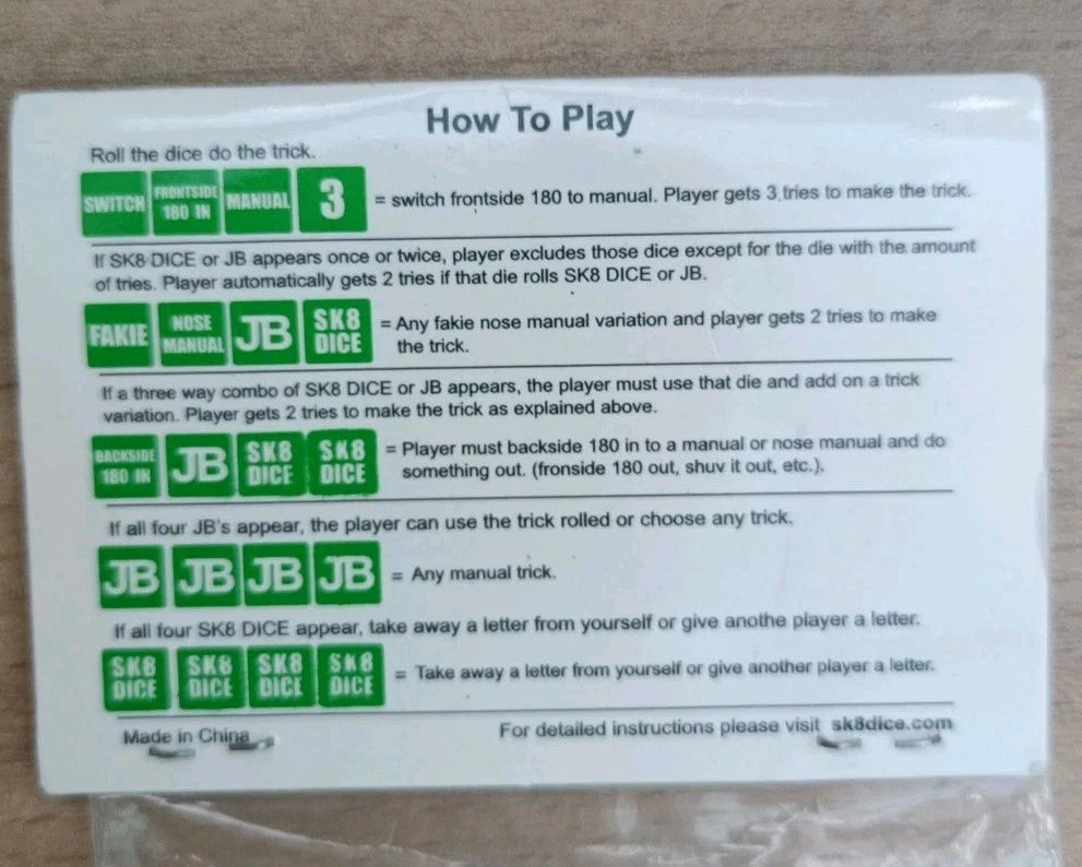 - The dice include different stances, such as switch or fakie, as well as specific tricks.