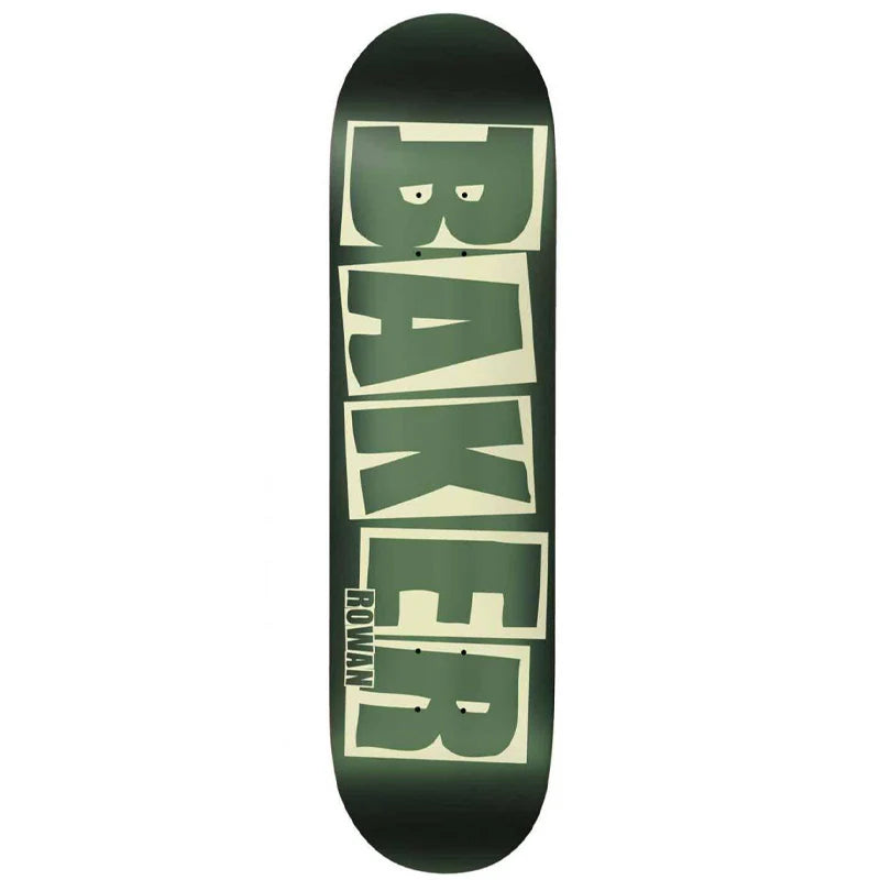The Rowan Zorrila pro model Baker Brand Logo Skateboard Deck has a shiny green foil graphic and is 8" wide. It is 31.5" long, and has a 14.25" wheelbase.